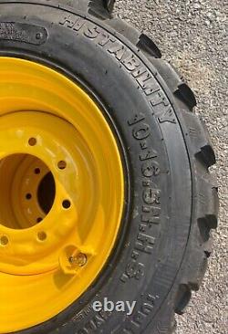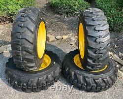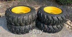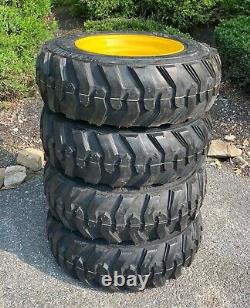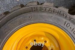 SET of 4 NEW 10X16.5 FORERUNNER SKS-1 Skid Steer Tires & Wheels - 12PLY. This is one complete set of 4 tires mounted on yellow rims for New Holland, John Deere & more. Ready to put on your machine & go! For New Holland LX565, LX665, L160, LS160, L170, LS170, L213, L215, L218, L220, John Deere 6675, 7775, 240, 315, 317 and will also fit many other machines.