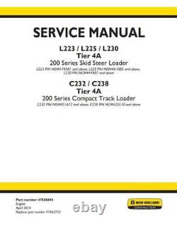 Electrical Schematic Poster - 47686156. Hydraulic Schematic Poster - 47551846. This is NOT a printed manual. This is a generic USB With a Loaded PDF file containing the full Service Manual For New Holland.L223 PIN NDM474381 and above. L225 PIN NDM461085 and above. L230 PIN NCM449907 and above.