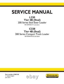 New Holland L230 C238 Tier 4B Skid Steer Loader Service Manual 47685160 PDF/USB. Contents:INTRODUCTIONEngine - 10Power coupling - 19Front axle system - 25Rear axle system - 27Hydrostatic drive - 29Brakes and controls - 33Hydraulic systems - 35Frames and ballasting - 39Wheels - 44Tracks and track suspension - 48Cab climate control - 50Electrical systems - 55Front loader and bucket - 82Platform, cab, bodywork, and decals - 90SPECIAL TOOL INDEX47899720 - Electrical Schematic Poster47899721 - Electrical Schematic Poster47886242 - Hydraulic Schematic PosterTotal Page Count: 2304This is NOT a printed manual. This is a generic USB With a Loaded PDF file containing the full Service Manual For New HollandL230 Tier 4B (final) 200 Series Skid Steer Loader PIN NFM483191 and above C238 Tier 4B (final) 200 Series Compact Track Loader PIN NFM470756 and aboveThis factory manual is distributed freely and globally under the terms of the GNU General Public License, and the LGPL Lesser General Public License, with free/open distribution license as demonstrated by EU laws reported by Commission Regulation (EC) n1400/2002 article 4 (2) of 31 July 2002 carmakers must give to independent garages and other interested persons, access to repair information. Front axle system - 25. Rear axle system - 27.